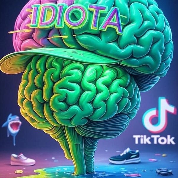 Behind it: fading TikTok symbols, sneakers, and sharks — fragments of digital madness.